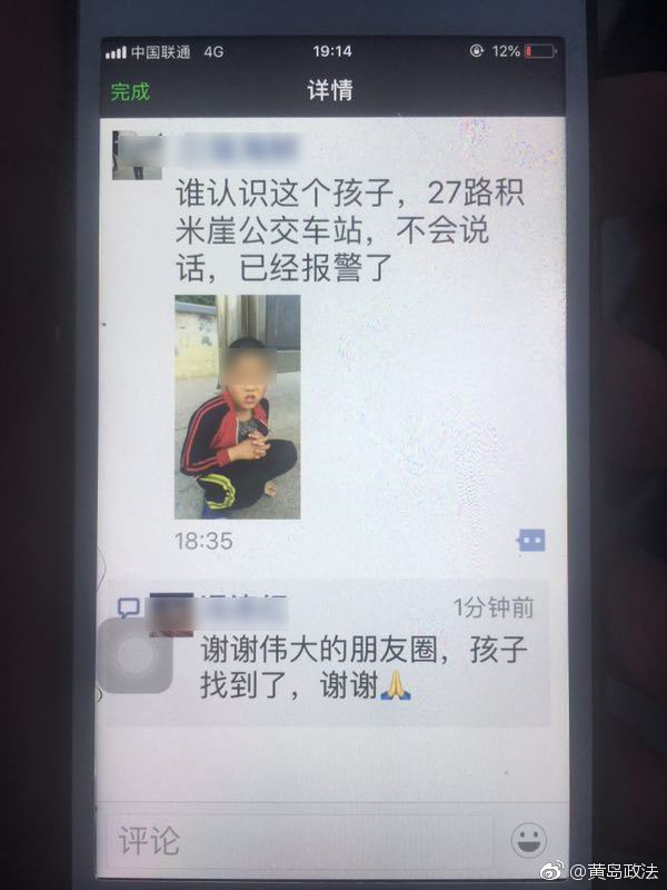 积米崖边防派出所民警将男孩接到了所内,一边照看着男孩,哄着男孩玩,一边想办法帮他找家人。民警向其他派出所发了协查,考虑到男孩家可能就住在附近,于是通过微信朋友圈发布了寻人信息,杨老师等人也都发了朋友圈寻人信息。大约晚上7点钟的时候,一名女士与积米崖边防派出所民警联系称,她通过微信朋友圈看到了寻人信息,认出男孩是她一位朋友的外甥,随后男孩的舅舅和母亲赶到积米崖边防派出所认领孩子。